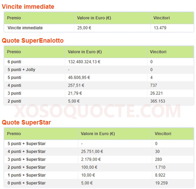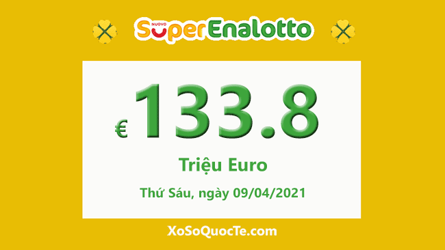 Giải jackpot của SuperEnalotto đã tăng tiếp lên €133,800,000 tương đương hơn 3,478 tỷ đồng. Phiên quay thưởng sẽ diễn ra vào Thứ Sáu, ngày 09/04/2021 – giờ Việt Nam.