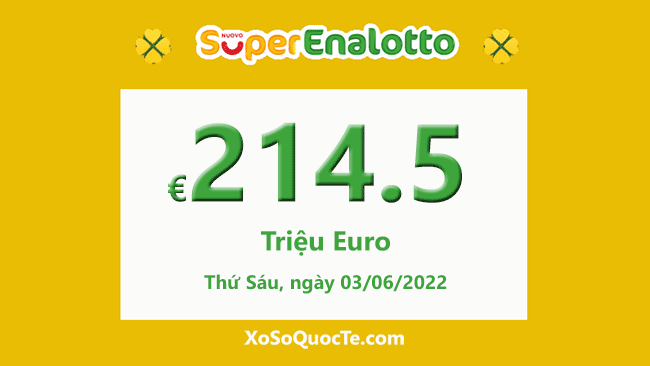 Giải jackpot của SuperEnalotto đã tăng tiếp lên €214,500,000. Phiên quay thưởng sẽ diễn ra vào Thứ Sáu, ngày 03/06/2022 – giờ Việt Nam. Ai sẽ là chủ nhân jackpot khủng của xổ số Ý?