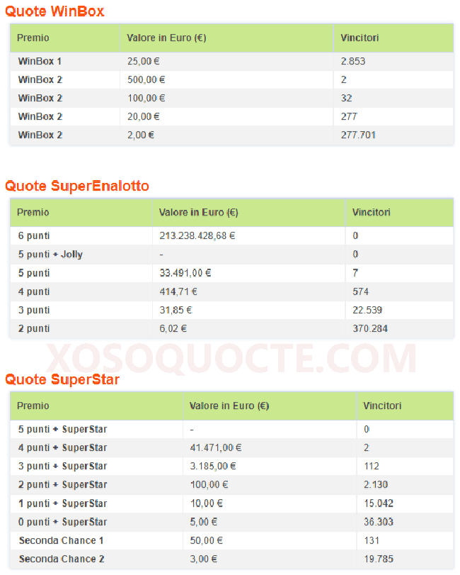 Giải jackpot xổ số tự chọn Super Enalotto của Ý tiếp tục tìm chủ nhân jackpot; và giá trị đã tăng lên tới €214.5 triệu Euro tương đương hơn 5,148 tỷ đồng.