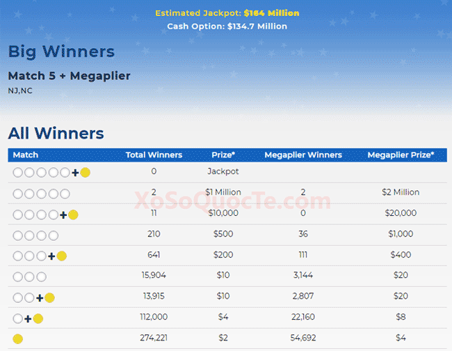Có 2 giải Nhất $2,000,000 dành cho 2 người chơi New Jersey, North Carolina (with Megaplier 2X). Cùng với đó là 11 người nhận giải Nhì. Cụ thể, có 10 giải $10,000; và 1 giải $15,209 (California). Bạn có thể theo dõi thông tin kết quả giải thưởng chi tiết trong bảng dưới đây.