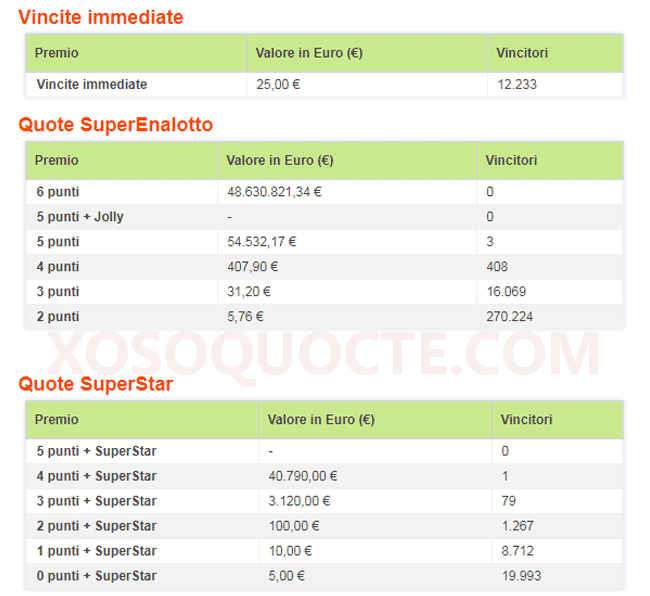 Jackpot tiếp tục đợi chủ và người chơi trúng giải lớn nhất trong phiên SuperEnalotto lần này là 3 người mua được những tấm vé trúng giải trị giá tới €54,532.17 tương đương hơn 1.4 tỷ VNĐ với việc trùng 5/6 số thường; 1 người trúng €40,790 với 4/6 số thường và số Super Star. Cùng với đó là nhiều giải khác như thông tin trong bảng dưới đây.