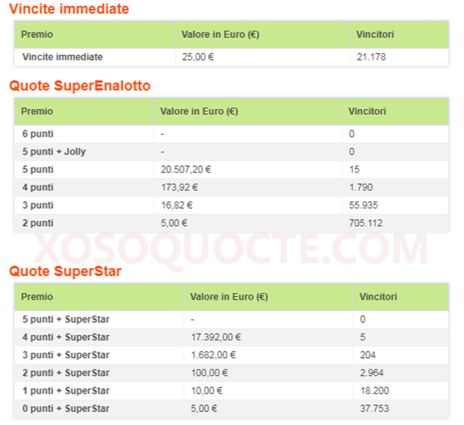 Jackpot tiếp tục đợi chủ và người chơi trúng giải lớn nhất trong phiên SuperEnalotto lần này là 15 người sở hữu những tấm vé trị giá 20.507,20 € tương đương hơn 533 triệu VNĐ với việc trùng 5/6 số thường. Cùng với đó là nhiều giải khác như kết quả trong bảng dưới đây.