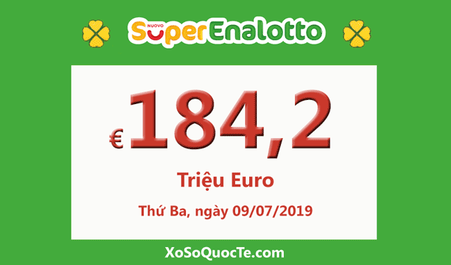 SuperEnalotto đang tiếp tục đợi người sở hữu được giải jackpot. Giá trị jackpot của SuperEnalotto hiện lên tới €184.200.000 euro. Phiên quay thưởng sẽ diễn ra vào Thứ Ba, ngày 09/07/2019.
