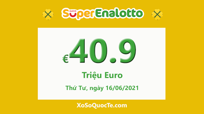 SuperEnalotto đang tiếp tục đợi người sở hữu được giải jackpot. Giá trị jackpot của SuperEnalotto hiện lên tới €40,900,000. Phiên quay thưởng sẽ diễn ra vào Thứ Tư, ngày 16/06/2021.