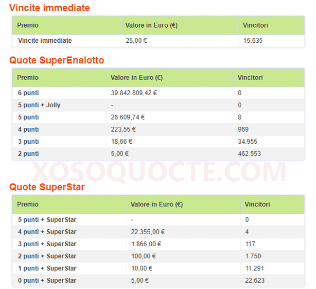 Jackpot tiếp tục đợi chủ, và những người chơi trúng giải lớn nhất trong phiên SuperEnalotto lần này là 8 người sở hữu những tấm vé trị giá €26,609.74 tương đương hơn 691 triệu VNĐ với việc trùng 5/6 số thường, và 4 người chơi nhận được €22,355 với những tấm vé trùng 4/6 số thường và số SuperStar. Cùng với đó là nhiều giải khác như kết quả trong bảng dưới đây.