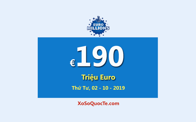 Giải thưởng Jackpot cho lần quay số kế tiếp của xổ số Euro Millions sẽ diễn ra vào Thứ Tư, ngày 2 tháng 10 năm 2019 (giờ Việt Nam) tiếp tục là €190 triệu EURO tương đương hơn 4940 tỷ VNĐ.