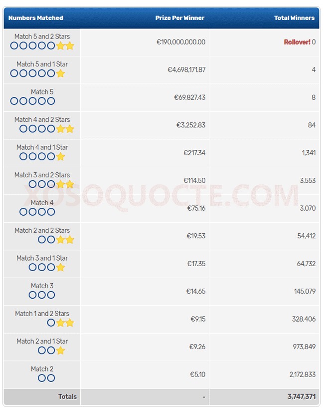 Phiên quay thưởng ngày 28/09/2019 (giờ Việt Nam) có tới 4 người may mắn trúng Giải Nhất khi sở hữu những tấm vé có 5 cặp số trùng với 5 cặp số trong kết quả xổ số Euro Millions và bị sai 1 số Lucky Stars. Mỗi người chơi này nhận được phần thưởng cực lớn trị giá €4,698.171.87 Euro. Cùng với đó là 8 giải thưởng €69,827.43 và rất nhiều giải thưởng khác được trao như thông tin trong bảng dưới đây.Hướng dẫn cách mua vé số Euro Millions sẽ cung cấp thông chi tiết cho bạn để mua vé trên trang web TheLotter hoặc mua vé bằng thẻ Visa Debit trên trang web LottoAgent. Các hướng dẫn cụ thể trong các bài viết dưới đây: