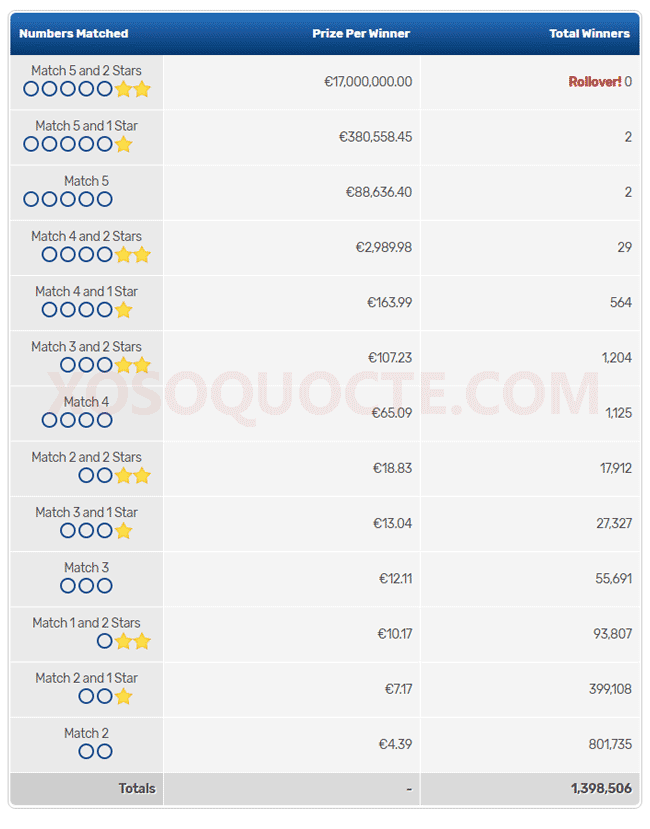 Phiên quay thưởng ngày 29/01/2020 tìm thấy 2 người may mắn trúng Giải Nhất với những tấm vé có 5 cặp số trùng với 5 số và 1 số Lucky Star trong kết quả xổ số Euro Millions. Mỗi người chơi này nhận được phần thưởng trị giá €380,558.45 Euro (tương đương hơn 9.8 tỷ đồng). Cùng với đó là hơn 1 triệu giải thưởng khác được trao như thông tin trong bảng dưới đây.