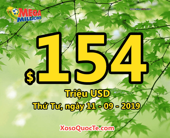 Sức nóng của Mega Millions càng tăng. Hiện tại, đây là giải xổ số có jackpot lớn thứ hai trên thế giới. Từ con số $139 triệu USD tuần trước tăng lên thành $154 triệu đô-la cho phiên quay thưởng ngày Thứ Tư, 11/09/2019 (giờ Việt Nam). Thần may mắn sẽ mỉm cười với những ai biết nắm bắt cơ hội dù là nhỏ nhất, biết đâu người trúng thưởng tiếp theo chính là bạn!