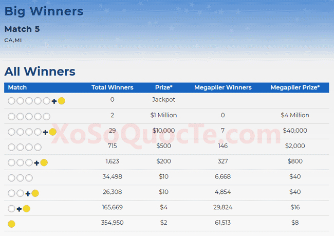 Hai người may mắn nhận giải Nhất từ Mega Millions gồm có một người chơi tới từ Michigan – người này nhận được $1 triệu đô-la; người chơi còn lại đến từ bang California nhận được $524,457 theo quy định của bang. Có tổng cộng 29 giải Nhì, trong đó có 17 giải Nhì trị giá $10,000 đô-la; 5 giải Nhì $3,837 đô-la (cho những tấm vé từ bang California) và 7 giải Nhì còn lại nhận được $40,000 nhờ ngôi sao may mắn Megaplier 4X trên tấm vé họ chọn. Cùng với đó là rất nhiều người may mắn khác nhận được những giải thưởng nhỏ hơn.