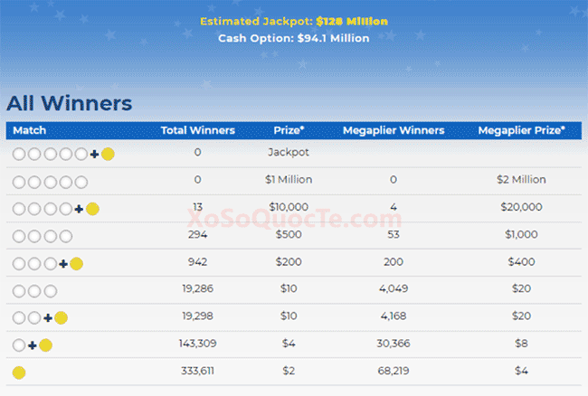 Dù chưa có ai may mắn trúng giải jackpot hay giải Nhất triệu đô, nhưng phiên quay thưởng này cũng ghi nhận có 7 người may mắn trúng Giải Nhì mỗi giải trị giá $10,000; 4 người nhờ Megaplier 2X mà nhận được tới $20,000; và 2 người chơi mua vé tại bang California trúng $8,562. Cùng với đó là 516,740 tấm vé may mắn trúng các giải nhỏ khác.Các giải xổ số Mega Millions và xổ số Powerball của Mỹ luôn tạo ra sự phấn khởi và niềm thích thú đối với hàng triệu người chơi trên khắp thế giới, khi giá trị giải thưởng Jackpot của các giải xổ số này leo lên các mốc cao “trăm triệu USD”.Lần quay số tiếp theo của xổ số Mega Millions sẽ diễn ra vào ngày Thứ Bảy, ngày 24 tháng 07 năm 2021 theo giờ Việt Nam, với giải thưởng trị giá $138 Triệu USD.