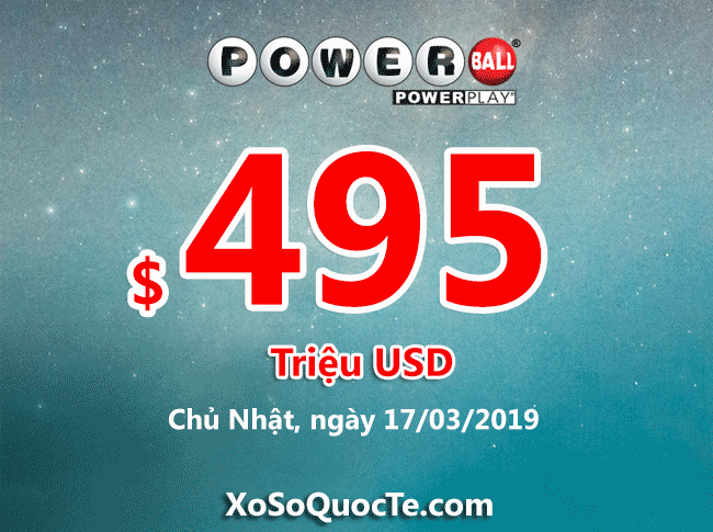 Powerball hiện tại đã tới mức $495 triệu USD (tương đương hơn 10800 tỷ VNĐ). Phiên quay thưởng mức giải này sẽ diễn ra vào ngày Chủ Nhật, ngày 17/03/2019 (giờ Việt Nam).