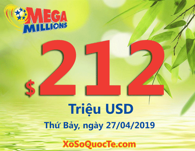 Giải thưởng cho lần quay số kế tiếp của xổ số Mega Millions diễn ra vào Thứ Bảy ngày 27 tháng 04 năm 2019 (giờ Việt Nam) tăng lên $212 triệu USD tương đương hơn 4,800 tỷ VNĐ.