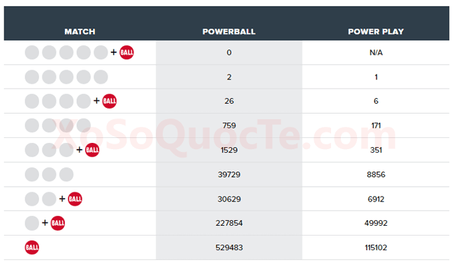 May mắn đã đến với rất nhiều người chơi trong phiên quay thưởng này. Có tới 3 người đã trúng giải Nhất của xổ số Powerball, trong đó là 2 người đến từ Nebraska và Texas nhận được $1 triệu đô-la, và 1 người trúng thưởng lớn nhất trị giá $2 triệu đô-la nhờ Power Play 2X đến từ Puerto Rico. Cùng với họ là 32 người đạt giải Nhì và hàng loạt các giải nhỏ hơn mà bạn có thể theo dõi trong bảng dưới đây. Với 26 người nhận được $50.000 đô-la (tương đương 1,1 tỷ VNĐ) và 6 người may mắn hơn nhận được $100.000 đô-la nhờ vào Power Play 2X.
