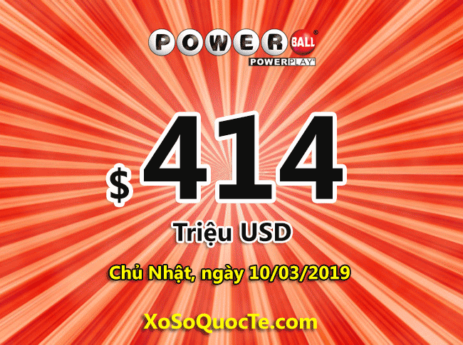 Theo thông báo chính thức từ hãng xổ số Powerball, hôm nay, ngày 07/03/2019, jackpot của họ đã trị giá tới $414 triệu USD – tương đương hơn 9100 tỷ VNĐ khi mà sau nhiều phiên liên tiếp chưa tìm được người trúng cả 6 con số may mắn của giải jackpot.