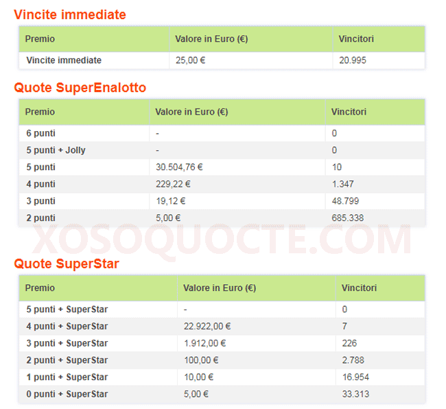Những người chơi nhận được giải lớn nhất trong phiên SuperEnalotto lần này là 10 người sở hữu những tấm vé trị giá 30.504,76 € tương đương hơn 793 triệu VNĐ với việc sở hữu những tấm vé trùng 5/6 số thường. Cùng với đó là nhiều giải khác như kết quả trong bảng dưới đây.Để tham gia chơi xổ số Ý SuperEnalotto, người chơi sẽ chọn 6 số trong dãy số từ 1-90 và 2 số phụ là số Jolly và số Super Star. Người chơi nào sở hữu tấm vé số SuperEnalotto có chứa cả 6 số trùng với kết quả của phiên quay thưởng sẽ trúng giải jackpot.