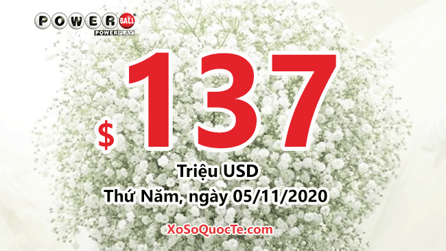 Powerball đã gom thêm $10 triệu đô la cho giải thưởng của mình đạt tới $137 triệu đô-la (tương đương hơn 3151 tỷ VNĐ) cho phiên ngày 05/11/2020 (giờ Việt Nam).