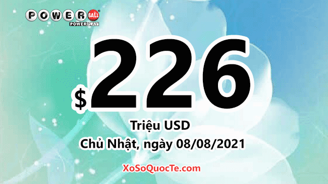 Powerball tiếp tục đẩy giá trị giải jackpot của mình lên mốc $226 triệu đô-la (tương đương hơn 5,424 tỷ VNĐ) cho phiên quay thưởng ngày 08/08/2021 (giờ Việt Nam).