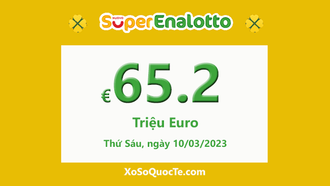 Giá trị jackpot của SuperEnalotto hiện là €65,200,000. Phiên quay thưởng sẽ diễn ra vào Chủ Nhật, ngày 10/03/2023 giờ Việt Nam.