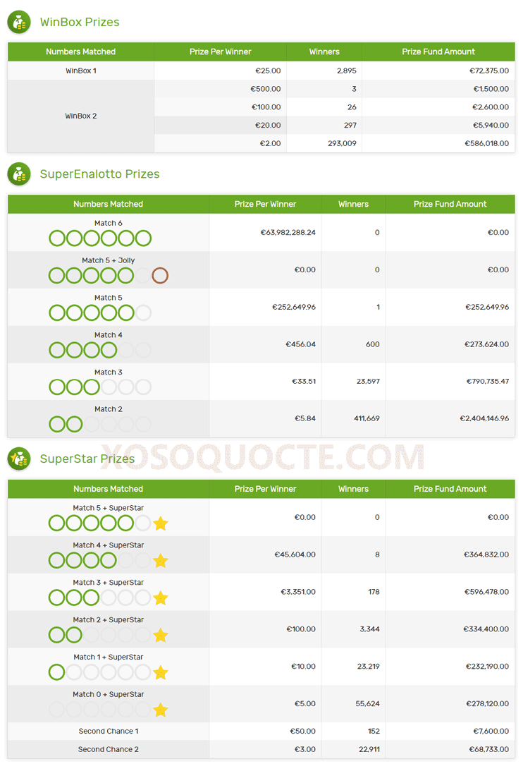 Jackpot chưa có chủ, và những người chơi trúng giải lớn nhất trong phiên SuperEnalotto này là 1 người sở hữu tấm vé giải Nhì trị giá €252,649.96 (tương đương hơn 6.3 tỷ đồng) với việc trùng 5/6 số thường; 8 người trúng €45,604 nhờ tấm vé trùng 4/6 số thường và số Super Star.
