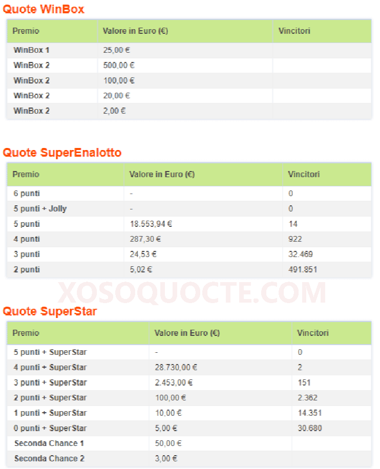 Jackpot chưa có chủ, và những người chơi trúng giải lớn nhất trong phiên SuperEnalotto này là 14 người sở hữu tấm vé trị giá €18,553.94 (tương đương hơn 445 triệu đồng) với việc trùng 5/6 số thường; 2 người trúng €28,730 nhờ tấm vè trùng 4/6 số thường và số Super Star. Cùng với đó là nhiều giải khác như kết quả trong bảng dưới đây.