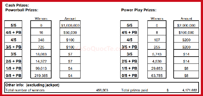 Các giải Nhì của xổ số tự chọn Powerball đã thuộc về 24 người chơi. Trong đó, có 15 người may mắn sở hữu những tấm vé trị giá $50,000; 8 người nhận được tới $100,000 nhờ dấu tích Power Play 2X; và 1 người tới từ bang California nhận được $33,732 theo luật lệ của bang này. Cùng với họ là 455,979 người chơi trúng các giải nhỏ hơn khác.