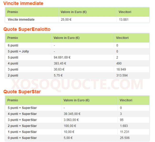 Xổ số SuperEnalotto là giải xổ số cực nổi tiếng của Ý với phần thưởng lớn trị giá hàng triệu Euro. SuperEnalotto tổ chức 3 phiên quay thưởng hàng tuần vào mỗi Thứ 4, Thứ 6 và Chủ Nhật (giờ Việt Nam). Người chiến thắng chỉ cần đóng khoản thuế ở Italia là 1,03 % nếu trúng số với giải thưởng lớn hơn €100; mức thuế 3.1 % sẽ được áp dụng nếu người chơi trúng số với giải thưởng lớn hơn €300; và mức thuế chỉ là 6 % nếu trúng xổ số với giải thưởng cao hơn € 500 bao gồm cả trúng giải Jackpot.