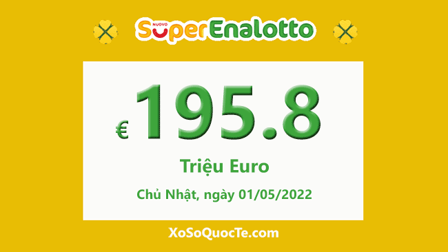 Giá trị jackpot của SuperEnalotto hiện là €195,800,000. Phiên quay thưởng sẽ diễn ra vào Chủ Nhật, ngày 01/05/2022 giờ Việt Nam.
