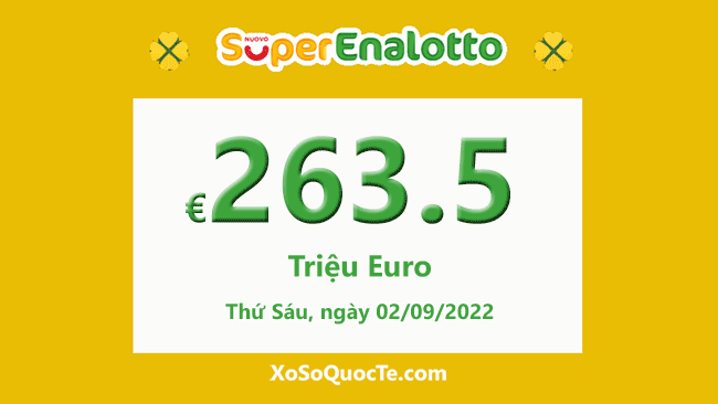 Giá trị jackpot của SuperEnalotto hiện là €263,500,000. Phiên quay thưởng sẽ diễn ra vào Thứ Sáu, ngày 02/09/2022 giờ Việt Nam.