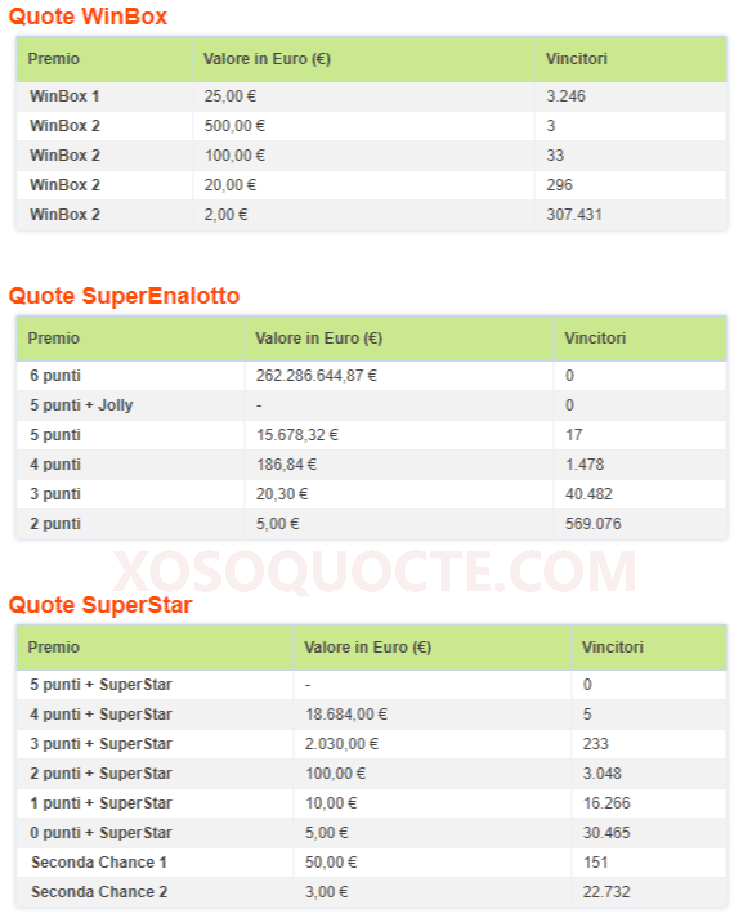 Jackpot chưa có chủ, và những người chơi trúng giải lớn nhất trong phiên SuperEnalotto này là 17 người sở hữu những tấm vé trị giá €15,678.32 (tương đương hơn 376 triệu đồng) với việc trùng 5/6 số thường; 5 người trúng €18,684 nhờ những tấm vè trùng 4/6 số thường và số Super Star. Cùng với đó là nhiều giải khác như kết quả trong bảng dưới đây.