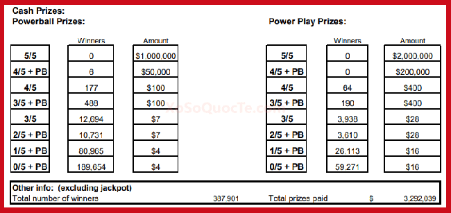 Jackpot xổ số tự chọn Powerball đang có giá trị lớn thứ hai thế giới (sau giải Mega Millions) trong số các giải xổ số tự chọn. Hiện, mức jackpot này vừa tăng lên $353 triệu đô-la tương đương hơn 8,119 tỷ VNĐ sau phiên quay thưởng diễn ra ngày 04/10/2022 theo giờ Việt Nam.