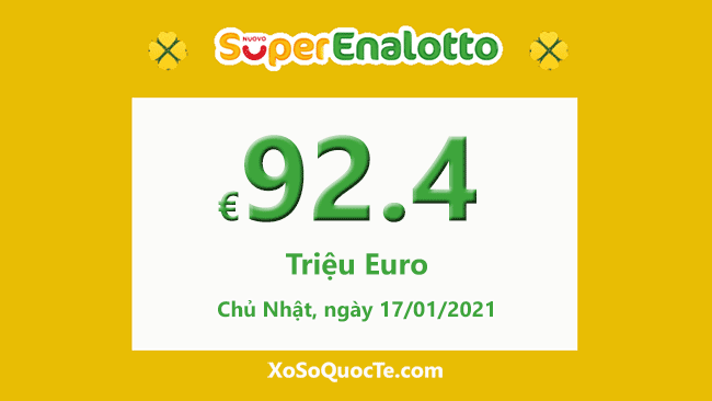 Giải jackpot của SuperEnalotto tiếp tục tăng lên tới €92,400,000 tương đương hơn 2402 tỷ đồng. Phiên quay thưởng sẽ diễn ra vào Chủ Nhật, ngày 17/01/2021.