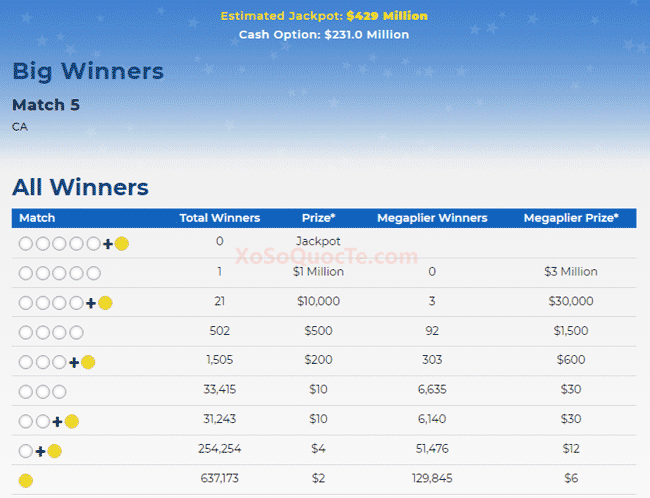 Đồng thời, có tới 14 giải Nhì trị giá $10,000; 3 giải Nhì trị giá $30,000 nhờ có Megaplier 3X; và 4 giải $8,708 (California).