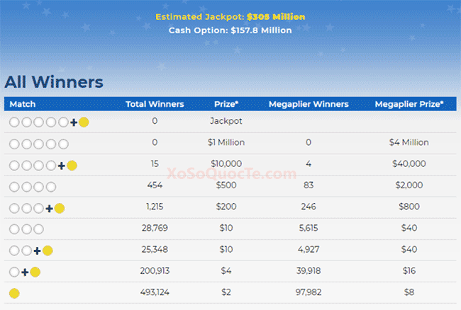 Trong phiên này, có tới 9 giải Nhì trị giá $10,000; 4 giải Nhì trị giá $40,000 nhờ có Megaplier 4X; và 2 giải $28,739 dành cho những người chơi tại bang California. Mega Millions cũng đã trao rất nhiều giải thưởng nhỏ hơn cho những người chơi may mắn khác như kết quả trong bảng dưới đây.