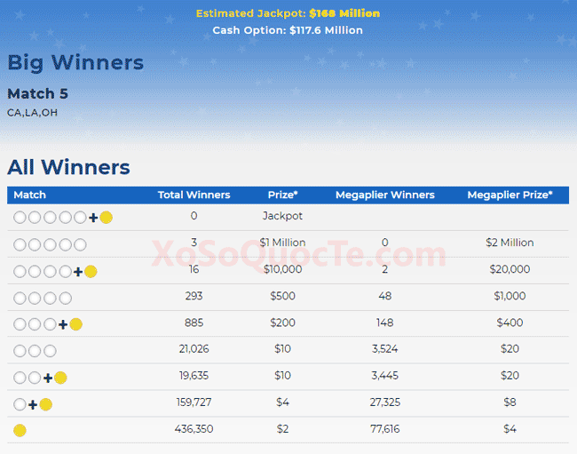 Ngày 05/02/2020 diễn ra phiên quay thưởng xổ số Mega Millions nổi tiếng của Nước Mỹ với giải thưởng Jackpot $168 triệu USD tương đương hơn 3,864 tỷ VNĐ. Giá trị giải jackpot của Mega Millions tiếp tục tăng lên.