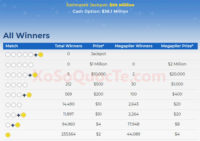 Giải thưởng lớn nhất cho lần quay số tiếp theo của xổ số Mega Millions là $55 triệu USD – diễn ra vào Thứ Tư, ngày 09 tháng 10 năm 2019 (giờ Việt Nam).