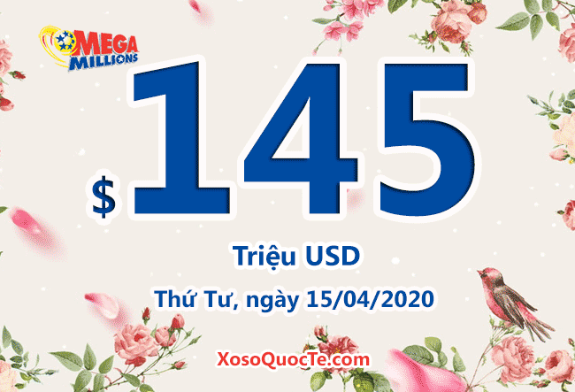 Lần quay số cho giải thưởng lớn $145 triệu đô-la tới đây của xổ số Mega Millions sẽ diễn ra vào Thứ Tư, ngày 15 tháng 04 năm 2020 theo giờ Việt Nam.