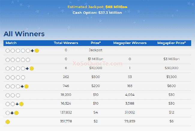 Phiên quay thưởng này ghi nhận có 6 người trúng giải Nhì của xổ số Mega Millions. Trong đó là 5 người trúng $10,0001 người khác nhận gấp ba lần giá trị giải Nhì là $30,000 với quyền ngôi sao may mắn Megaplier 3X. Ngoài ra, Mega Millions cũng trao nhiều giải nhỏ hơn khác.Người chơi trên toàn thế giới trong đó có Việt Nam thường nhờ Các nhà cung cấp dịch vụ Mua Hộ Vé Số giúp đỡ mua “hộ vé số thật trên đất Mỹ”.