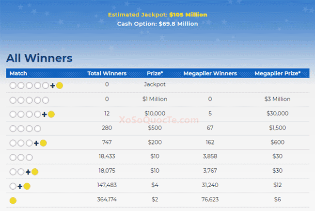 Những người chơi may mắn nhất trong phiên quay thưởng này là 6 người nhận giải Nhì của xổ số Mega Millions trị giá $10,000 đô-la (tương đương hơn 230 triệu đồng), 5 người khác nhận được $30,000 nhờ có Megaplier 3X, và 1 người chơi mua vé tại bang California trúng $48,322 theo luật của bang này. Xổ số Mega Millions của Mỹ là một giải xổ số đã xuất hiện từ rất lâu và khá nổi tiếng trên thế giới với giải thưởng đặc biệt (giải Jackpot) bắt đầu từ $20 triệu đô-la Mỹ (tương đương khoảng 460 tỷ VNĐ) và có thể được tích lên đến hàng trăm triệu đô-la.