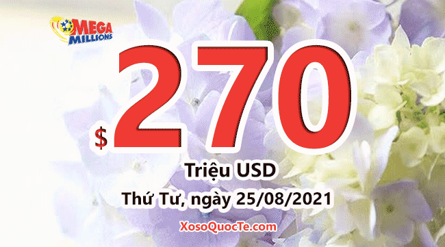 Giải jackpot của Mega Millions sắp tới là $270 triệu đô-la cho phiên quay thưởng vào Thứ Tư, ngày 25/08/2021 (giờ Việt Nam). Biết đâu người may mắn nhất là bạn!