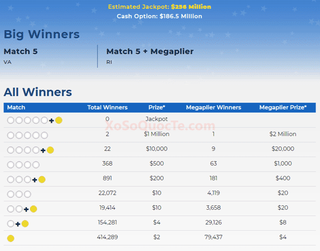 Những người chơi may mắn nhất nhận giải từ Mega Millions là 2 người chơi trúng giải Nhất. Người chơi tới từ Virginia sở hữu giải thưởng $1 triệu đô, người chơi mua vé từ Rhode Island trúng $2,000,000 với Megaplier 2X.
