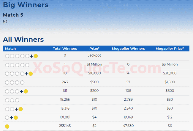 Người may mắn nhất nhận giải từ Mega Millions là một người chơi tới từ New Jersey khi sở hữu giải thưởng $1 triệu đô. Cùng với đó là rất nhiều người may mắn khác nhận được những giải thưởng nhỏ hơn. Đó là 6 giải Nhì $10.000 đô-la; 4 giải Nhì khác trị giá tới $30.000 nhờ ngôi sao may mắn trên tấm vé họ chọn.