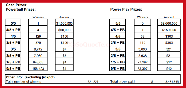 Powerball đã trao 1 giải Nhất $489,235 cho người chơi mua vé từ bang California. 5 giải Nhì, Trong đó, có 3 người mỗi người nhận được $50,000 (tương đương hơn 1,1 tỷ VNĐ), 1 người nhận được $150,000 với Power Play 3X, và 1 người trúng $23,192, cùng với đó là rất nhiều giải thưởng nhỏ hơn khác.