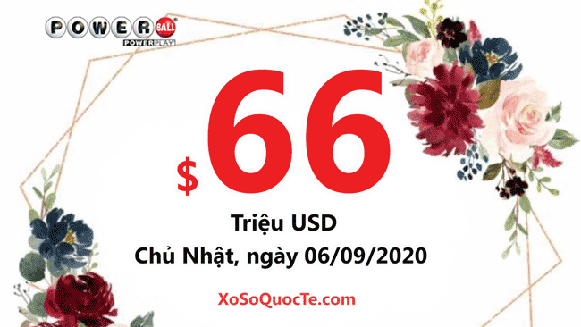 Giải thưởng cho lần quay số kế tiếp của xổ số Powerball diễn ra vào Chủ Nhật, ngày 06 tháng 09 năm 2020 (theo giờ Việt Nam) tiếp tục với $66 triệu đô-la tương đương hơn 1518 tỷ VNĐ.