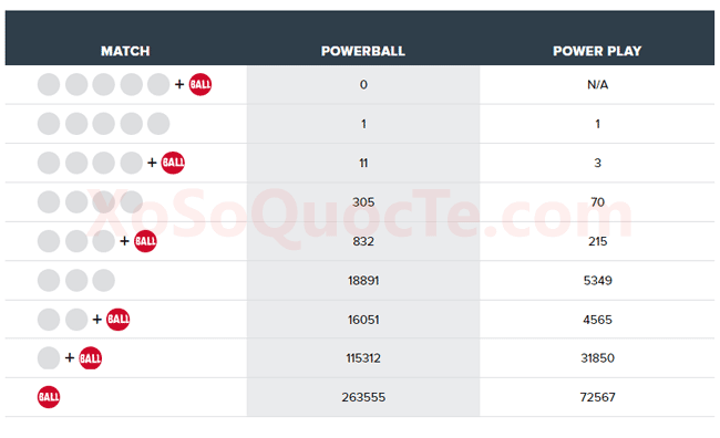Giải Nhất của xổ số Powerball đã tìm đến với 2 người. Trong đó,1 người New Hampshire trúng $1,000,000 và 1 người Pennsylvania nhận được tới $2,000,000 với quyền lựa chọn Power Play. Bên cạnh đó, có 14 người trúng giải Nhì, trong đó có 10 người trúng $50.000 đô-la, 1 người trúng $92.836 đến từ California và đặc biệt là 3 người được nhận tới $150.000 đô-la nhờ dấu tích vào quyền Power Play đầy quyền lực giúp nhân 3 lần giá trị giải thưởng .