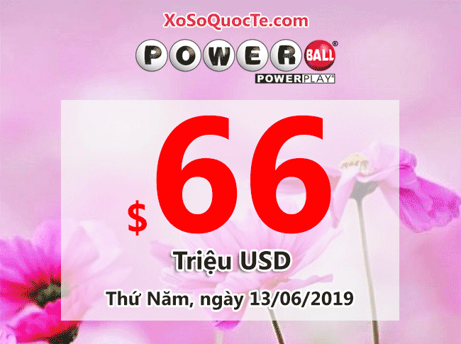 Giải thưởng cho lần quay số kế tiếp của xổ số Powerball diễn ra vào Thứ Năm, ngày 13 tháng 06 năm 2019 (theo giờ Việt Nam) tăng lên $66 triệu USD.