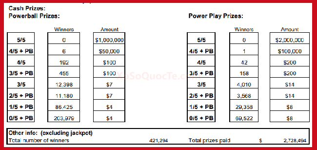 Theo thông tin từ hãng xổ số Powerball, phiên quay thưởng lần này tìm thấy là 7 người may mắn trúng giải Nhì. Trong đó, 6 người nhận được giải thưởng mỗi giải trị giá $50,000; và 1 người nhận được giải thưởng trị giá $100,000 nhờ có thêm tùy chọn Ngôi Sao May Mắn – Power Play 2X.