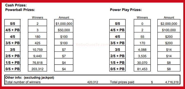 Xổ số Powerball trao 2 giải Nhất $1,000,000 cho hai người chơi mua vé tại các bang Arizona và Georgia. Cũng có 5 giải Nhì trong phiên quay thưởng này. Trong đó có 3 giải Nhì $50,000; và 2 giải Nhì $100,000 nhờ Power Play 2X. Cùng với đó là nhiều giải nhỏ hơn với các phần thưởng từ $3 – $726. Độc giả có thể theo dõi phiên quay thưởng của Powerball ngay dưới đây: