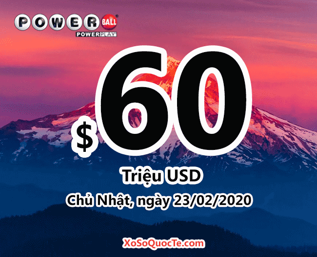 Giải thưởng xổ số Powerball cho lần quay số kế tiếp diễn ra vào Chủ Nhật, ngày 23 tháng 02 năm 2020 (theo giờ Việt Nam) lên mốc $60 triệu USD tương đương hơn 1380 tỷ VNĐ.