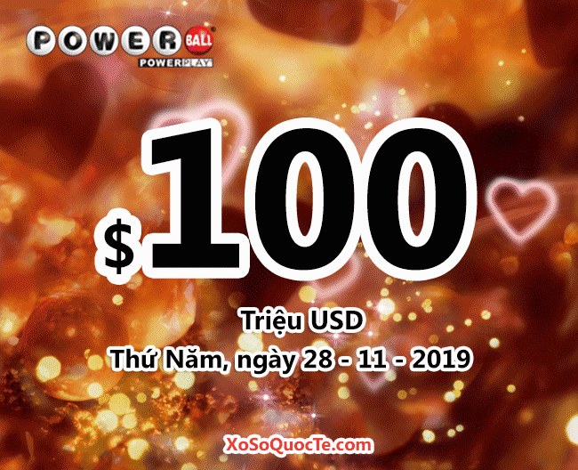 Giải thưởng cho lần quay số kế tiếp của xổ số Powerball diễn ra vào Thứ Năm, ngày 28 tháng 11 năm 2019 (theo giờ Việt Nam) tiếp tục với $100 triệu USD tương đương hơn 2300 tỷ VNĐ.